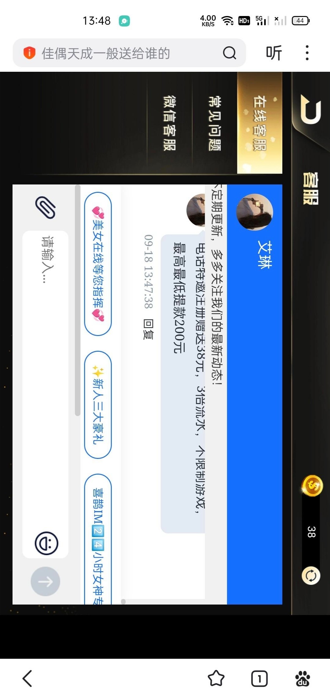 接到电话登录上去显示手机号注册过了,我记得好像以前领过一次38了也没充值过,然后登录上去找在线客服又送了38,没有游戏限制三倍流水,出款自测。 网址 87x.app